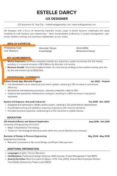 Primeiro vem as áreas de expertise, depois os resultados, logo mais as experiências e por fim a formação seguida de alguns detalhes adicionais.