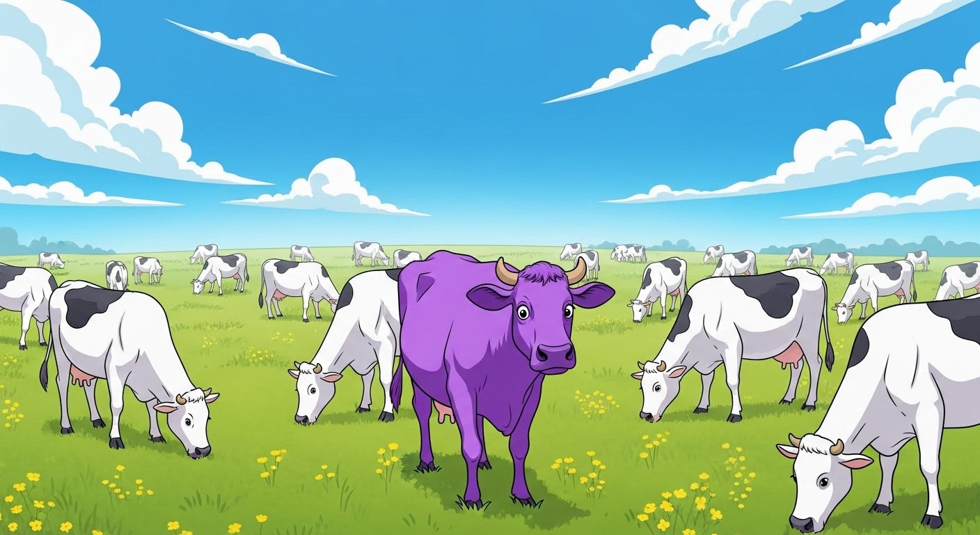 Antes de continuar, vou explicar a teoria da vaca roxa (bem por cima)